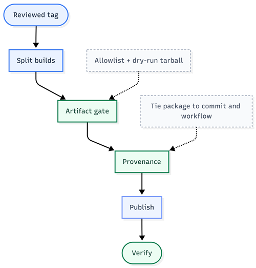 First, packaging is a security boundary. Many teams still behave as if security ends after code review, SAST, and secret scanning. It does not. The publishable artifact is the thing the world actually receives. That is what deserves the hard gate.
